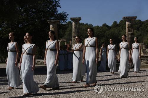 epa09529900 Greek actress Xanthi Georgiou (C), playing the role of High Priestess, holds the flame during the Olympic flame lighting ceremony for the Beijing 2022 Winter Olympics, at the Ancient Olympia site in Peloponnese, southern Greece, 18 October 2021. The four Tibetan activists, one man and three women were detained by police in ancient Olympia. EPA/YANNIS KOLESIDIS