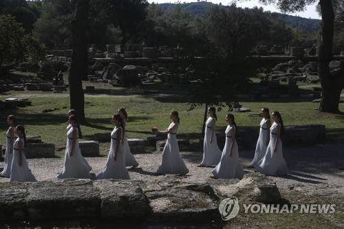 epa09529899 Greek actress Xanthi Georgiou (C), playing the role of High Priestess, holds the flame during the Olympic flame lighting ceremony for the Beijing 2022 Winter Olympics, at the Ancient Olympia site in Peloponnese, southern Greece, 18 October 2021. The four Tibetan activists, one man and three women were detained by police in ancient Olympia. EPA/YANNIS KOLESIDIS