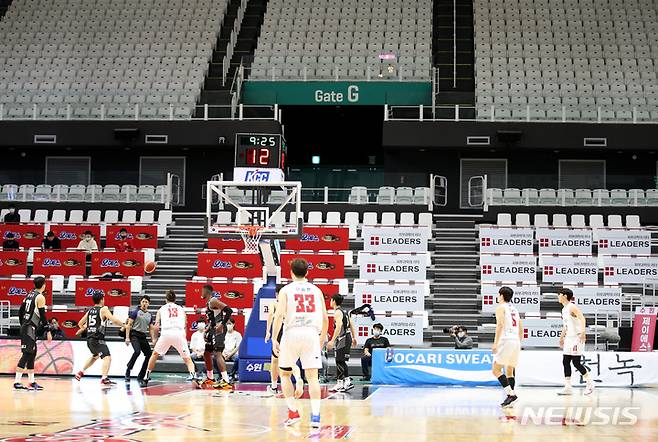 [수원=뉴시스] 정병혁 기자 = 18일 오후 경기 수원시 서수원칠보체육관에서 열린 2021-2022 프로농구 수원 KT 소닉붐과 고양 오리온 오리온스의 경기가 무관중으로 열리고 있다. 지난 15일 발표된 코로나19 사회적 거리두기 조정안에 따르면 프로농구의 경우 21일부터 4단계 지역에서도 코로나19 접종 완료자에 한해 경기장 수용 인원의 20%의 관중 입장이 허용된다. 2021.10.18. jhope@newsis.com