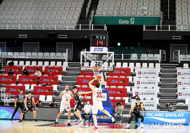 [수원=뉴시스] 정병혁 기자 = 18일 오후 경기 수원시 서수원칠보체육관에서 열린 2021-2022 프로농구 수원 KT 소닉붐과 고양 오리온 오리온스의 경기가 무관중으로 열리고 있다. 지난 15일 발표된 코로나19 사회적 거리두기 조정안에 따르면 프로농구의 경우 21일부터 4단계 지역에서도 코로나19 접종 완료자에 한해 경기장 수용 인원의 20%의 관중 입장이 허용된다. 2021.10.18. jhope@newsis.com