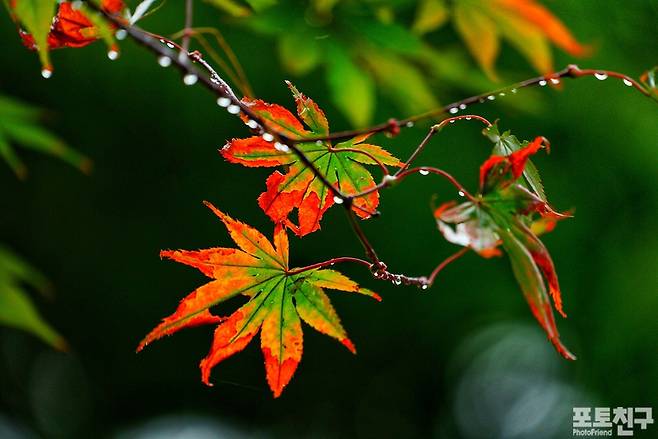 단풍나무 잎새는 울긋불긋하고, 물방울도 맺혔습니다.