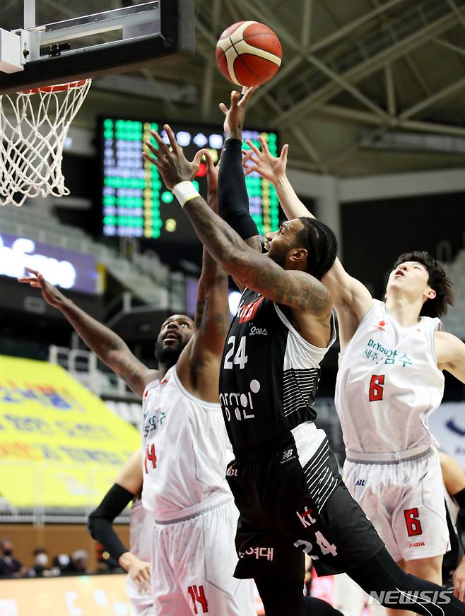 [수원=뉴시스] 정병혁 기자 = 18일 오후 경기 수원시 서수원칠보체육관에서 열린 2021-2022 KGC인삼공사 정관장 프로농구 수원 KT 소닉붐과 고양 오리온 오리온스의 경기, KT 마이어스가 슛을 하고 있다. 2021.10.18. jhope@newsis.com
