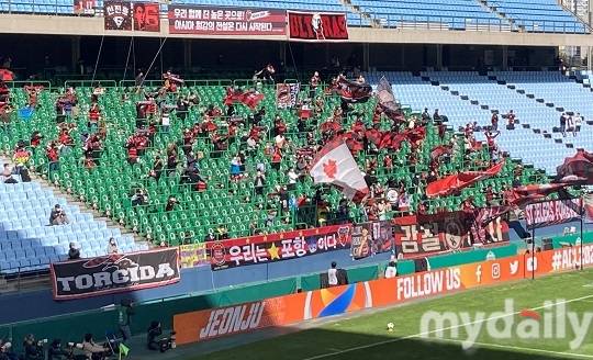 포항 팬들은 N석과 E석, W석에 나누어 착석했다. 그중 N석은 전주성을 홈으로 쓰는 전북현대 팬들의 공식 응원석이다. 기존에는 N석에 녹색 유니폼과 녹색 깃발, 녹색 걸개가 가득했으나, 이날엔 모든 게 검붉은 색이었다. E석과 W석에도 포항의 붉은 유니폼을 입거나, 붉은 머플러를 두른 팬들이 앉았다. 포항 팬들이 본격적으로 응원을 시작하자 골라인 뒤에 있던 카메라들이 이들의 모습을 렌즈에 담았다.