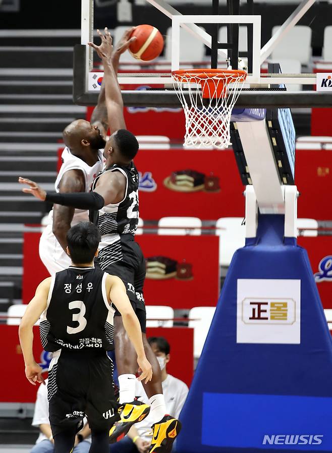 [수원=뉴시스] 정병혁 기자 = 18일 오후 경기 수원시 서수원칠보체육관에서 열린 2021-2022 KGC인삼공사 정관장 프로농구 수원 KT 소닉붐과 고양 오리온 오리온스의 경기, 오리온 할로웨이가 덩크슛을 하고 있다. 2021.10.18. jhope@newsis.com