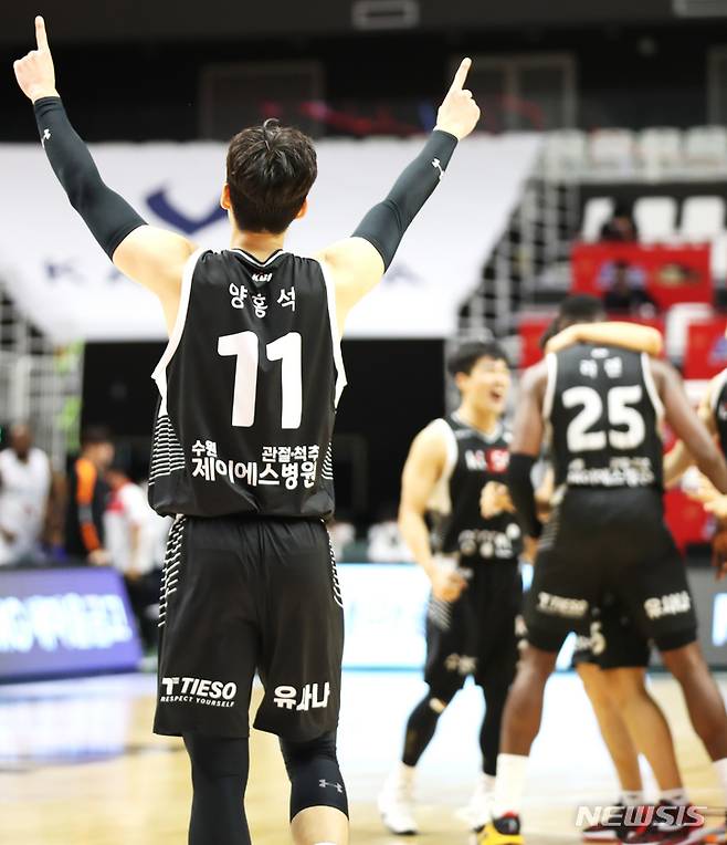 [수원=뉴시스] 정병혁 기자 = 18일 오후 경기 수원시 서수원칠보체육관에서 열린 2021-2022 KGC인삼공사 정관장 프로농구 수원 KT 소닉붐과 고양 오리온 오리온스의 경기, KT 양홍석이 손을 들어보이고 있다. 2021.10.18. jhope@newsis.com