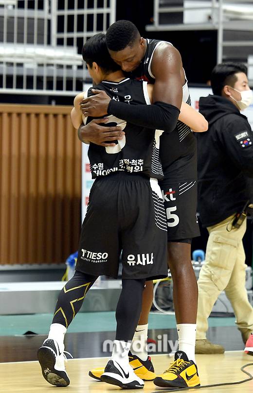 [마이데일리 = 수원(경기도) 유진형 기자] 수원 KT 라렌과 정성우가 18일 오후 경기도 수원KT소닉붐아레나에서 진행된 '2021-2022 KGC인삼공사 정관장 프로농구' 수원 KT와 고양 오리온과의 경기에서 72-62로 승리한 뒤 기뻐하고 있다.