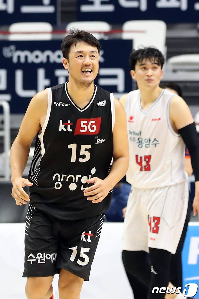(수원=뉴스1) 황기선 기자 = 18일 오후 경기도 수원시 권선구 수원 KT 소닉붐 아레나에서 열린 '2021-2022 KGC인삼공사 정관장 프로농구' 수원 KT 소닉붐과 고양 오리온의 경기에서 3점슛을 성공시킨 KT 김동욱이 기뻐하고 있다. 2021.10.18/뉴스1