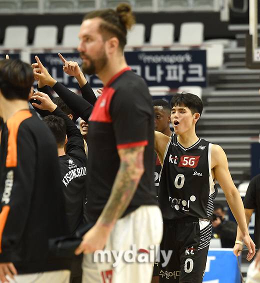 [마이데일리 = 수원(경기도) 유진형 기자] 수원 KT 하윤기가 18일 오후 경기도 수원KT소닉붐아레나에서 진행된 '2021-2022 KGC인삼공사 정관장 프로농구' 수원 KT와 고양 오리온과의 경기에서 72-62로 승리한 뒤 기뻐하고 있다.