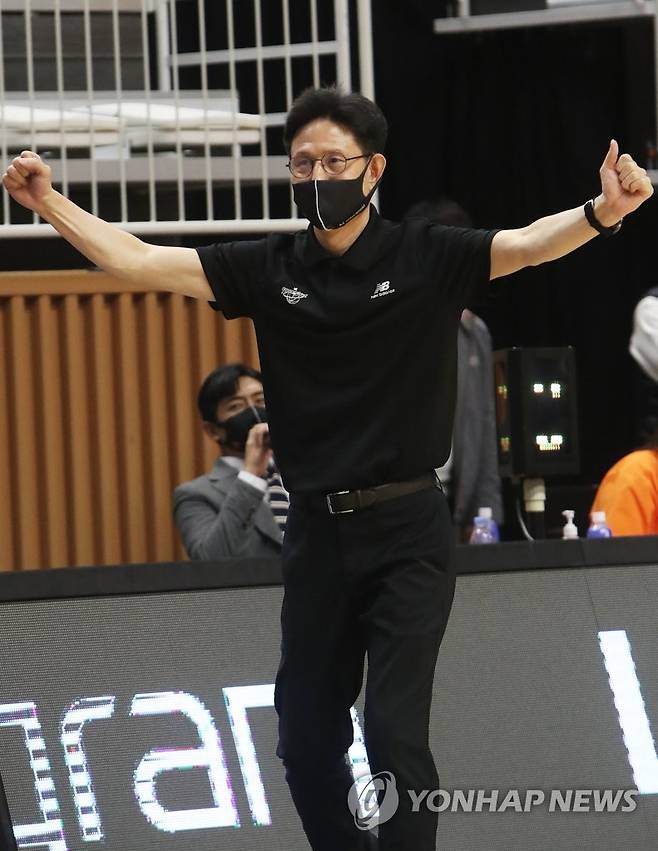 (수원=연합뉴스) 홍기원 기자 = 18일 경기도 서수원칠보체육관에서 열린 프로농구 수원 KT 소닉붐과 고양 오리온 오리온스의 경기. KT 서동철 감독이 득점 성공에 기뻐하고 있다. 2021.10.18