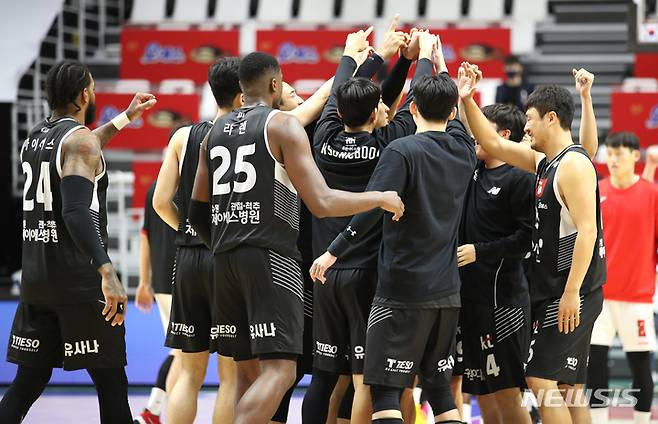 [수원=뉴시스] 정병혁 기자 = 18일 오후 경기 수원시 서수원칠보체육관에서 열린 2021-2022 KGC인삼공사 정관장 프로농구 수원 KT 소닉붐과 고양 오리온 오리온스의 경기, 72대 62로 승리한 수원 KT 소닉붐 선수들이 기뻐하고 있다. 2021.10.18. jhope@newsis.com