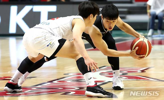 [수원=뉴시스] 정병혁 기자 = 18일 오후 경기 수원시 서수원칠보체육관에서 열린 2021-2022 KGC인삼공사 정관장 프로농구 수원 KT 소닉붐과 고양 오리온 오리온스의 경기, KT 정성우가 돌파하고 있다. 2021.10.18. jhope@newsis.com