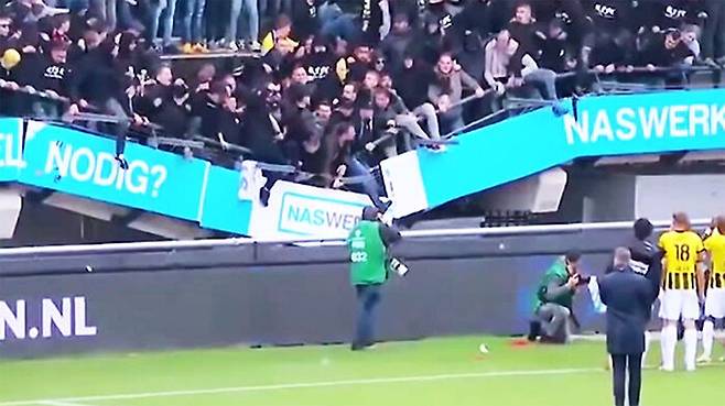 네덜란드 프로축구에서는 열광에 휩싸인 관중석이 무너지는 아찔한 사고가 발생했는데요.