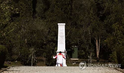 epa09529999 First torchbearer, Greek alpine skier Ioannis Antoiou, carrying the Olympic Torch kneels in front of the monument of Pierre de Coubertin, the founder of the International Olympic Committee (IOC), during the Olympic Flame lighting ceremony for the Beijing 2022 Winter Olympics at the Ancient Olympia site in Peloponnese, southern Greece, 18 October 2021. EPA/YANNIS KOLESIDIS