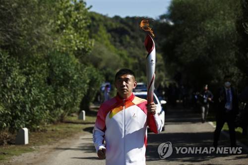 epa09530010 Second torchbearer Li Jiajun, China's five-time Olympic medallist in short track speedskating, carries the Olympic Torch during the Olympic Flame lighting ceremony for the Beijing 2022 Winter Olympics at the Ancient Olympia site in Peloponnese, southern Greece, 18 October 2021. EPA/YANNIS KOLESIDIS