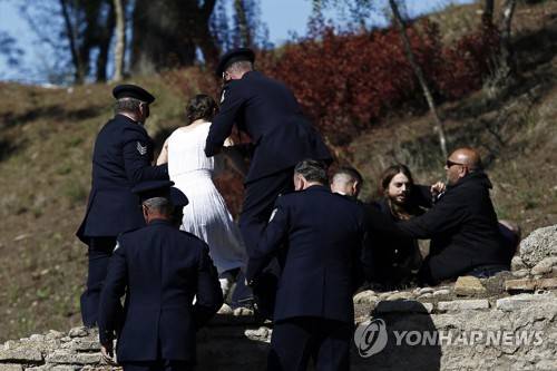 epa09530014 Policemen detain Tibetan activists after they invaded the Olympic Flame lighting ceremony for the Beijing 2022 Winter Olympics at the Ancient Olympia site in Peloponnese, southern Greece, 18 October 2021. Four Tibetan activists, one man and three women were detained by police in ancient Olympia. EPA/YANNIS KOLESIDIS