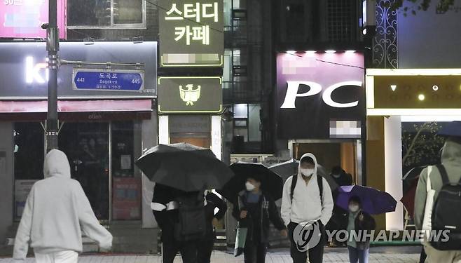 (서울=연합뉴스) 한상균 기자 = 18일부터 2주간 수도권에서는 낮과 밤 구분 없이 최대 8명, 비수도권에서는 최대 10명까지 모일 수 있다. 4단계 지역 독서실·스터디카페·공연장·영화관은 밤 12시까지 영업할 수 있다. 이날 밤 서울 대치동 학원가에서 학생들이 스터디카페 앞을 지나고 있다. 2021.10.18