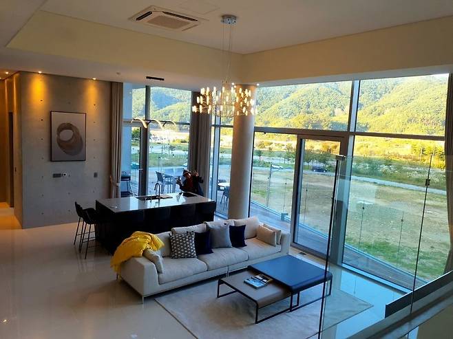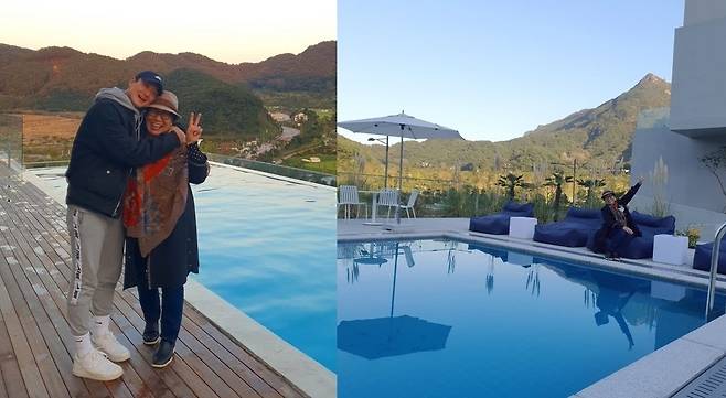 사진엔 자연경관과 어우러진 호화 풀빌라 전경과 즐겁게 웃고 있는 시어머니의 모습이 담겼다. 고급스러운 인테리어까지 눈길을 끈다.