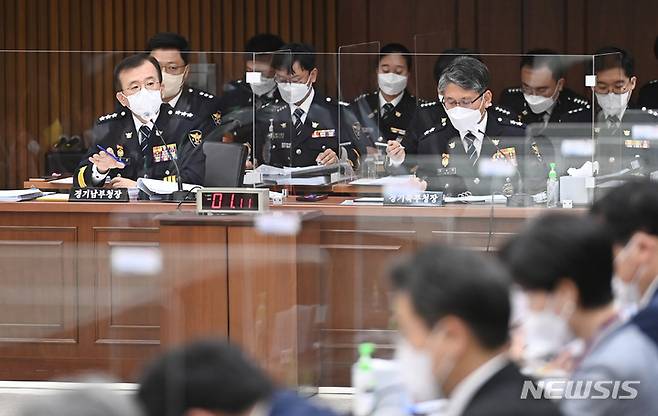 [수원=뉴시스] 김종택기자 = 김원준 경기남부경찰청장(사진 왼쪽)이 18일 오후 경기도 수원시 경기남부경찰청 대회의실에서 열린 국회 행정안전위원회의 경기남·북부경찰청에 대한 국정감사에서 의원 질의에 답변하고 있다. 2021.10.18.