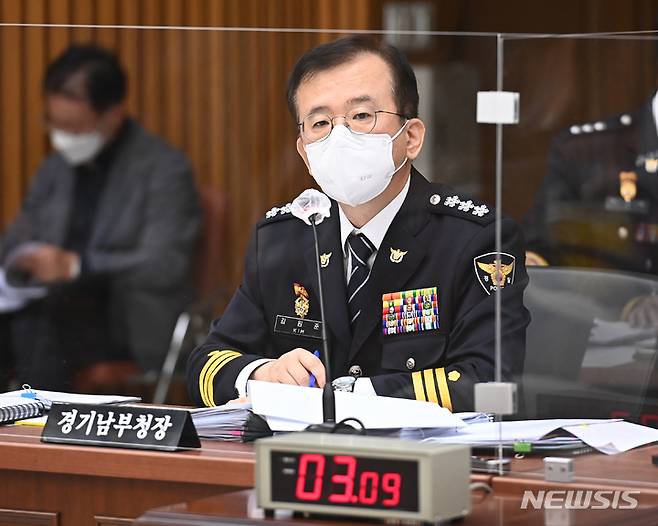 [수원=뉴시스] 김종택기자 = 김원준 경기남부경찰청장이 18일 오후 경기도 수원시 경기남부경찰청 대회의실에서 열린 국회 행정안전위원회의 경기남·북부경찰청에 대한 국정감사에서 의원 질의에 답변하고 있다. 2021.10.18.