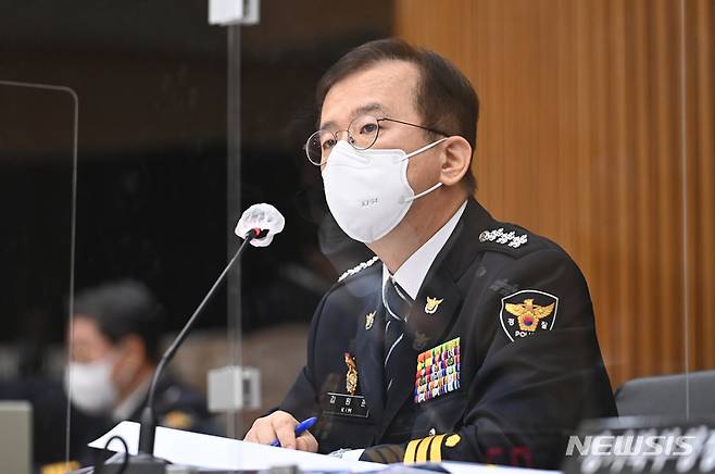 [수원=뉴시스] 김종택기자 = 김원준 경기남부경찰청장이 18일 오후 경기도 수원시 경기남부경찰청 대회의실에서 열린 국회 행정안전위원회의 경기남·북부경찰청에 대한 국정감사에서 의원 질의에 답변하고 있다. 2021.10.18.