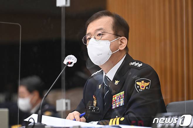 (수원=뉴스1) 경기사진공동취재단 = 김원준 경기남부경찰청장이 18일 오후 경기도 수원시 장안구 경기남부경찰청 대회의실에서 열린 국회 행정안전위원회의 경기남·북부경찰청에 대한 국정감사에서 의원 질의에 답변하고 있다. 2021.10.18/뉴스1