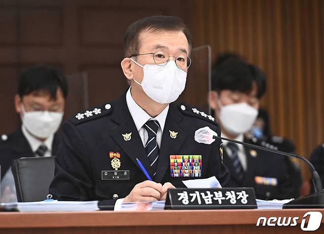 (수원=뉴스1) 경기사진공동취재단 = 김원준 경기남부경찰청장이 18일 오후 경기도 수원시 장안구 경기남부경찰청 대회의실에서 열린 국회 행정안전위원회의 경기남·북부경찰청에 대한 국정감사에서 의원 질의에 답변하고 있다. 2021.10.18/뉴스1