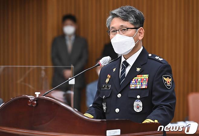 (수원=뉴스1) 경기사진공동취재단 = 김남현 경기북부경찰청장이 18일 오후 경기도 수원시 장안구 경기남부경찰청 대회의실에서 열린 국회 행정안전위원회의 경기남·북부경찰청에 대한 국정감사에서 업무보고를 하고 있다. 2021.10.18/뉴스1