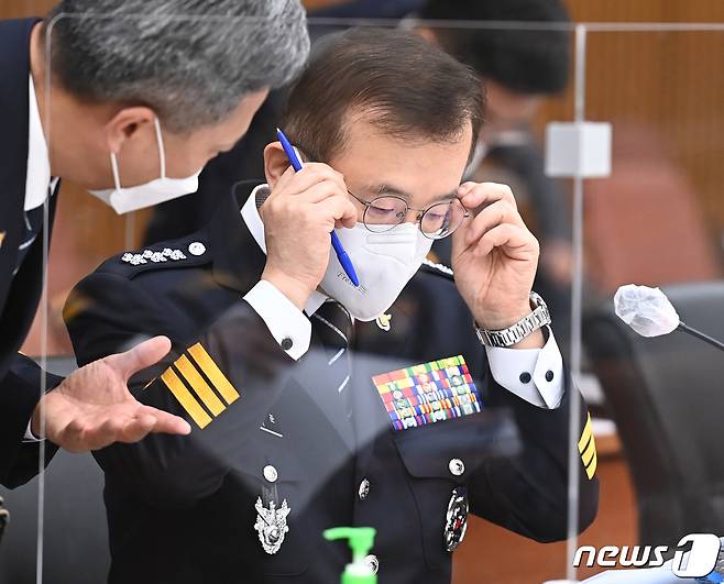 (수원=뉴스1) 경기사진공동취재단 = 김원준 경기남부경찰청장이 18일 오후 경기도 수원시 장안구 경기남부경찰청 대회의실에서 열린 국회 행정안전위원회의 경기남·북부경찰청에 대한 국정감사에서 자료를 살펴보고 있다. 2021.10.18/뉴스1