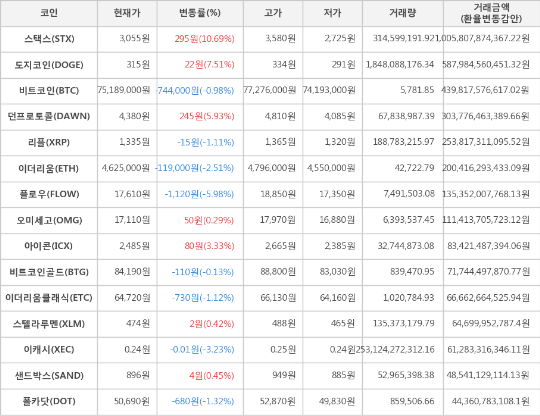 상승세를 보이는 가상화폐는 총 7종목으로 이 중 가장 큰 상승세를 보이는 스택스는 전일 대비 10.69% 상승한 3,055원에 거래되고 있다.