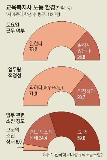 일이 많다 보니 주말 근무도 불가피하다. 토요일에도 일한다고 응답한 비율은 73.2%에 달했다. 토요일 평균 노동시간은 4.6시간으로 조사됐다. 박현희 학비노조 전국교육복지사분과장은 “관리가 필요한 학생의 학부모 상담을 평일에 하기 어려워 토요일에도 일하는 경우가 잦다”고 말했다.