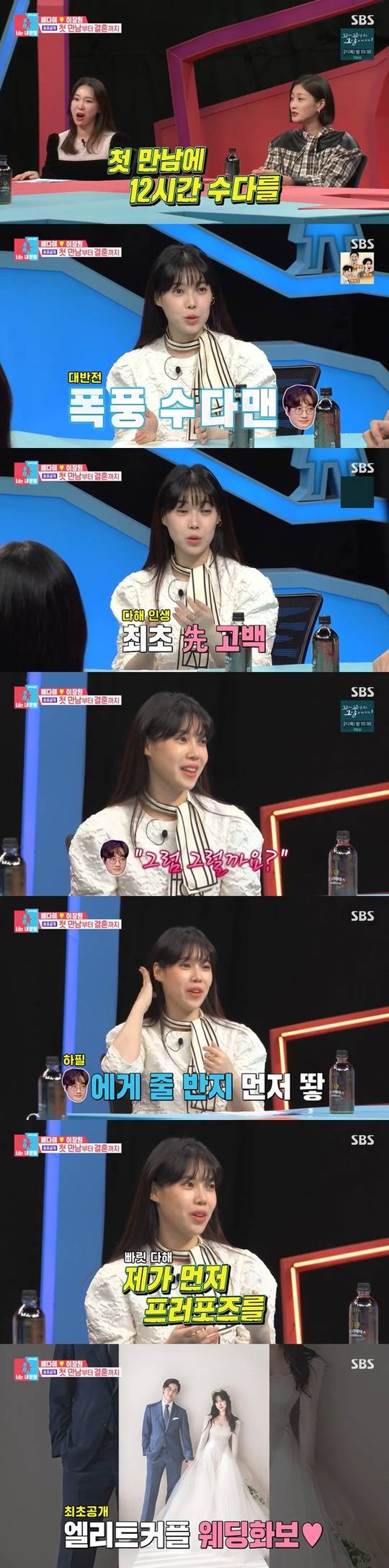뒤이어 배다해는 프러포즈도 먼저 했다며 “오빠 집에 ‘스타워즈’ 장난감 반지가 있었다. 싱겁게 자꾸 제 손에 끼워봐서 속아줬는데 이걸로 측정이 안 되니 같이 가자고 하더라. 저는 오빠 반지해주고 싶어서 같이 맞췄는데 오빠 반지가 먼저 나왔다. 하루 차이였는데 성격이 급해서 먼저 했다”고 털어놨다.