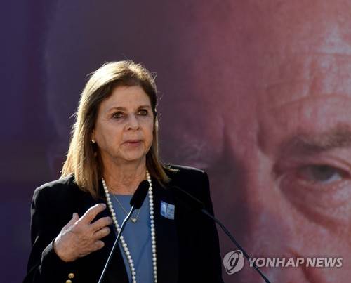 epa09530259 Dalia Rabin speaks at the state memorial ceremony for her late father Prime Minister Yitzhak Rabin at the Mt. Herzl Cemetery in Jerusalem, 18 October 2021. Israel is marking 26 years since PM Rabin was assassinated by Yigal Amir, an extremist Jewish Israeli. EPA/DEBBIE HILL / POOL