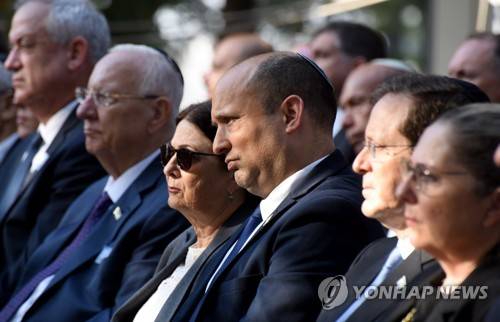 epa09530266 Israeli Prime Minister Naftali Bennett (C) attends the state memorial ceremony for the late Prime Minister Yitzhak Rabin at the Mt. Herzl Cemetery in Jerusalem, 18 October 2021. Israel is marking 26 years since PM Rabin was assassinated by Yigal Amir, an extremist Jewish Israeli. EPA/DEBBIE HILL / POOL