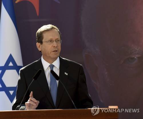 Israeli President Isaac Herzog speaks at the state memorial ceremony for the late Prime Minister Yitzhak Rabin at the Mt. Herzl Cemetery in Jerusalem, Monday, Oct. 18, 2021. Israel is marking 26 years since Rabin was assassinated by Yigal Amir, an extremist Jewish Israeli. (Debbie Hill/Pool via AP) POOL PHOTO