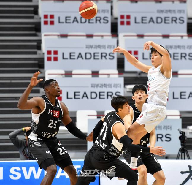 오리온 한호빈이 18일 수원KT소닉붐 아레나에서 열린 2021-22프로농구 수원 KT소닉붐과 고양 오리온 오리온스의 경기에서 볼을 돌리고 있다 . 2021.10.18.