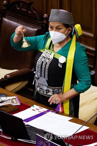 epa09530924 Elisa Loncon, president of the Constitutional Convention (CC), speaks during the meeting that starts the debate to draft the new constitution, in Santiago, Chile, 18 October 2021. Coinciding with the second anniversary of the greatest social crisis in the 31 years of Chilean democracy, this 18 October a new milestone is woven in the constituent convention: the start of the debate on the norms of the future Magna Carta. EPA/Alberto Valdes