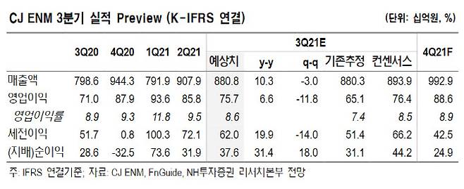 NH투자증권은 19일 CJ ENM(035760)에 대해 예능과 드라마 등 다양한 콘텐츠의 흥행으로 광고 매출 성장과 티빙 유료가입자 상승이 두드러진다고 전했다.