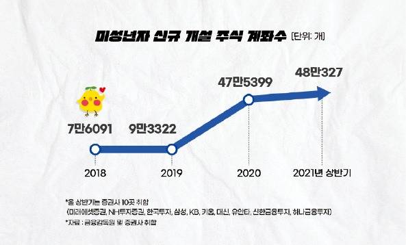 작년부터 시작된 주식 열풍으로 주식 계좌를 새로 만든 미성년자가 크게 늘었습니다. 국내 10개 증권사의 누적 미성년자 계좌 수는 지난 8월 초 기준 116만2605개로 100만 개를 돌파했습니다. 작년까지만 해도 누적 계좌가 50만 개를 밑돌았는데 올 들어서 그 수가 폭발적으로 늘어난 것이죠.