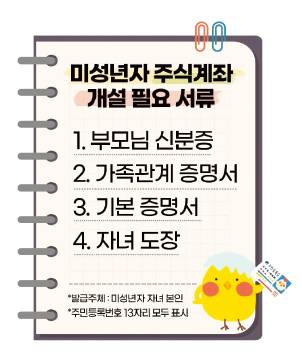 그런데 미성년자가 증권사 계좌를 개설하는 과정은 성인보다 까다롭습니다. 비대면 개설이 불가능하거든요. 거래 수수료도 성인보다 조금 더 비쌉니다. 증권사들은 만 19세 미만의 고객인 경우 법정대리인(부모 또는 법정후견인)이 증권사 영업점에 방문해 계좌를 개설하도록 하고 있습니다. 부모님 신분증, 가족관계증명서, 기본증명서, 본인 도장을 챙겨 방문하면 됩니다. 대부분 최근 3개월 내 발급된 서류를 요구합니다. 발급 주체는 미성년자 본인으로 맞추고 서류에 기재되는 주민등록번호는 뒷자리까지 모두 노출돼야 합니다. 정부민원포털을 이용하면 인터넷에서 무료로 발급받을 수 있습니다.