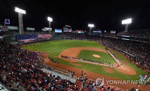 epa09531156 Boston Red Sox (R) and Houston Astros (L) players line the foul lines during pregame ceremonies before the start of game three of the MLB American League Championship Series between the Boston Red Sox and the Houston Astros at Fenway Park in Boston, Massachusetts, USA, 18 October 2021. EPA/JOHN CETRINO