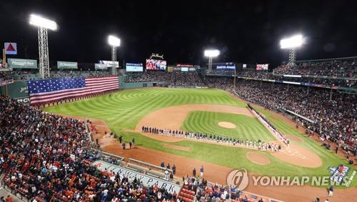epa09531159 Boston Red Sox (R) and Houston Astros (L) players line the foul lines during pregame ceremonies before the start of game three of the MLB American League Championship Series between the Boston Red Sox and the Houston Astros at Fenway Park in Boston, Massachusetts, USA, 18 October 2021. EPA/JOHN CETRINO
