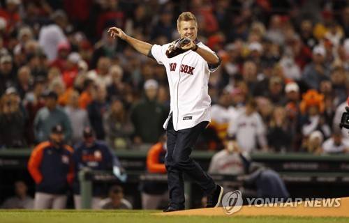 epa09531161 Former Boston Red Sox pitcher Johnathan Papelbon reacts after throwing out the cermeonial first pitch during pregame ceremonies before the start of game three of the MLB American League Championship Series between the Boston Red Sox and the Houston Astros at Fenway Park in Boston, Massachusetts, USA, 18 October 2021. EPA/CJ GUNTHER