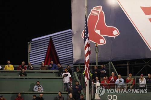 epa09531163 Fans stand atop of famed Green Monster left field wall for the national anthem during pregame ceremonies before the start of game three of the MLB American League Championship Series between the Boston Red Sox and the Houston Astros at Fenway Park in Boston, Massachusetts, USA, 18 October 2021. EPA/CJ GUNTHER