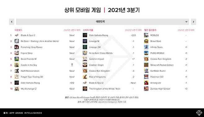 3분기 가장 많이 다운로드된 게임은 엔씨소프트의 ‘블레이드 & 소울 2’였다. 코모에 게임즈의 어드벤처 RPG ‘Re: 제로부터 시작하는 이세계 생활 Lost in Memories’, 홍콩 히어로 엔터테인먼트의 액션 RPG ‘퍼니싱: 그레이 레이븐’이 2, 3위를 차지했다.