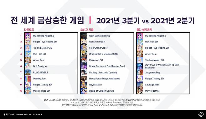 모바일 데이터 및 분석 플랫폼인 앱애니가 19일 발표한 ‘2021년 3분기 모바일 게임 결산’을 보면, 3분기 전 세계 소비자들이 iOS 및 구글플레이를 통해 모바일 게임을 약 145억 회 다운로드 하고, 역대 최고 분기 기록인 230억 달러(약 27조 원)를 지출한 것으로 나타났다.