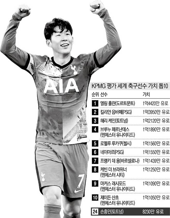 독일 스카이스포츠는 18일 공식사회관계망서비스(SNS)에 글로벌 회계·컨설팅 회사인 KPMG가 유럽에서 뛰는 축구선수를 대상으로 가치를 매긴 톱30을 공개했다. 손흥민은 8230만 유로(약 1133억원)로 평가받아 24위에 자리했다. 2019년 7월 KPMG 평가에서 7880만 유로(35위)였는데, 소폭 상승했다. 그때나 지금이나 아시아 선수로 이 명단에 이름을 올린 선수는 손흥민이 유일하다. 스카이스포츠는 “KPMG가 일정 기간 선수들의 시장 가치를 조사 분석한 결과”라며 “개개인의 능력치 뿐 아니라 리그 경쟁력, 계약 기간, 마케팅 잠재력 등을 평가한 자료”라고 설명했다.
