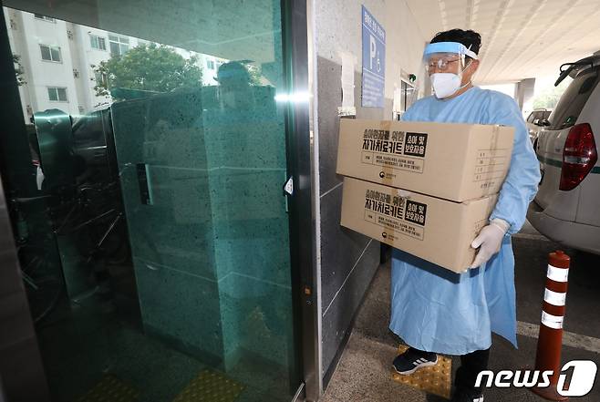 (인천=뉴스1) 정진욱 기자 = '인천형 코로나19 재택치료'가 시작하는 19일 오전 인천시 부평구 보건소 관계자가 재택치료 물품을 가정에 배달하고 있다. 재택치료는 당사자가 동의한 경우에 한해 이뤄지며, 대상자는 원칙적으로 입원요인이 없는 70세 미만의 무증상·경증 확진자가 된다.재택치료 대상자는 재택치료키트, 생필품 등 지원물품이 전달되며, 전담 공무원 지정과 안전보호 앱 설치를 통해 자가격리자 보다 엄격한 수준으로 관리된다. 재택치료 기간 중 10일 이상 증상이 발생하지 않는 등 격리해제 기준을 충족하게 되면 담당의사가 모니터링 결과를 기반으로 재택치료 해제여부를 판단한다. 2021.10.19/뉴스1