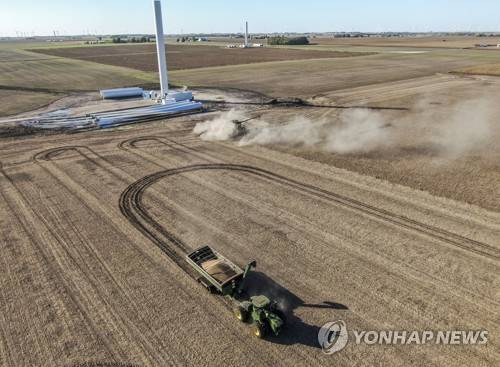 epa09531247 An aerial photo made with a drone shows farmers harvesting soybeans near windmills being constructed near Paw Paw, Illinois, USA, 18 October 2021. According to the National Agricultural Statistics Service Illinois farmers can expect soybean yields of 64 bushels per acre on 675 million bushels expected to be harvested. EPA/TANNEN MAURY