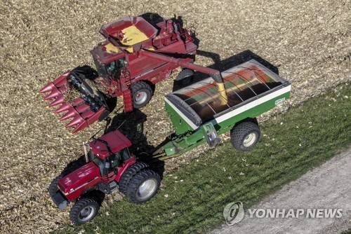 epa09531256 An aerial photo made with a drone show a farmer offloading his combine as he harvests corn near Steward, Illinois, USA, 18 October 2021. According to the National Agricultural Statistics Service Illinois farmers can expect corn yields of 214 bushels per acre which is up 22 bushels over the previous year. EPA/TANNEN MAURY