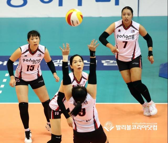 【발리볼코리아닷컴(충북 단양)=김경수 기자】 19일(화) 충북 단양군 단양국민체육센터에서 열린 2021 신협중앙회장배 실업배구 종합선수권대회 여자부 3-4순위결정전 양산시청 vs 포항시체육회 경기에서 포항시체육회 세터 여달샘의 토스를 고송희, 이윤희, 변채림이 바라보고 있다. 이번대회는 총 9개팀이 참가한 가운데 10월 16일(토) 부터 20일(수) 까지 충북 단양국민육센터에서 열린다. 2021.10.19.